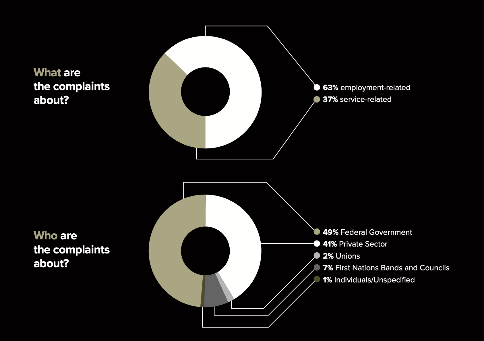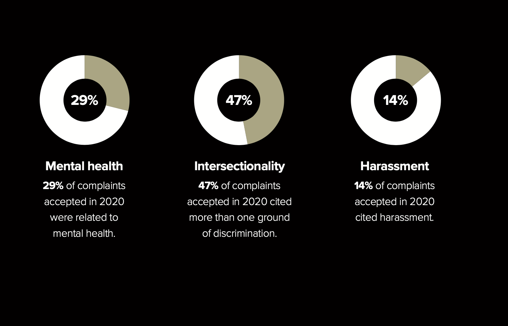 The statistics outlined in this section break down those complaints in 2020 that the Commission was able to mediate, investigate or litigate because they met the criteria outlined in Canadian Human Rights Act.