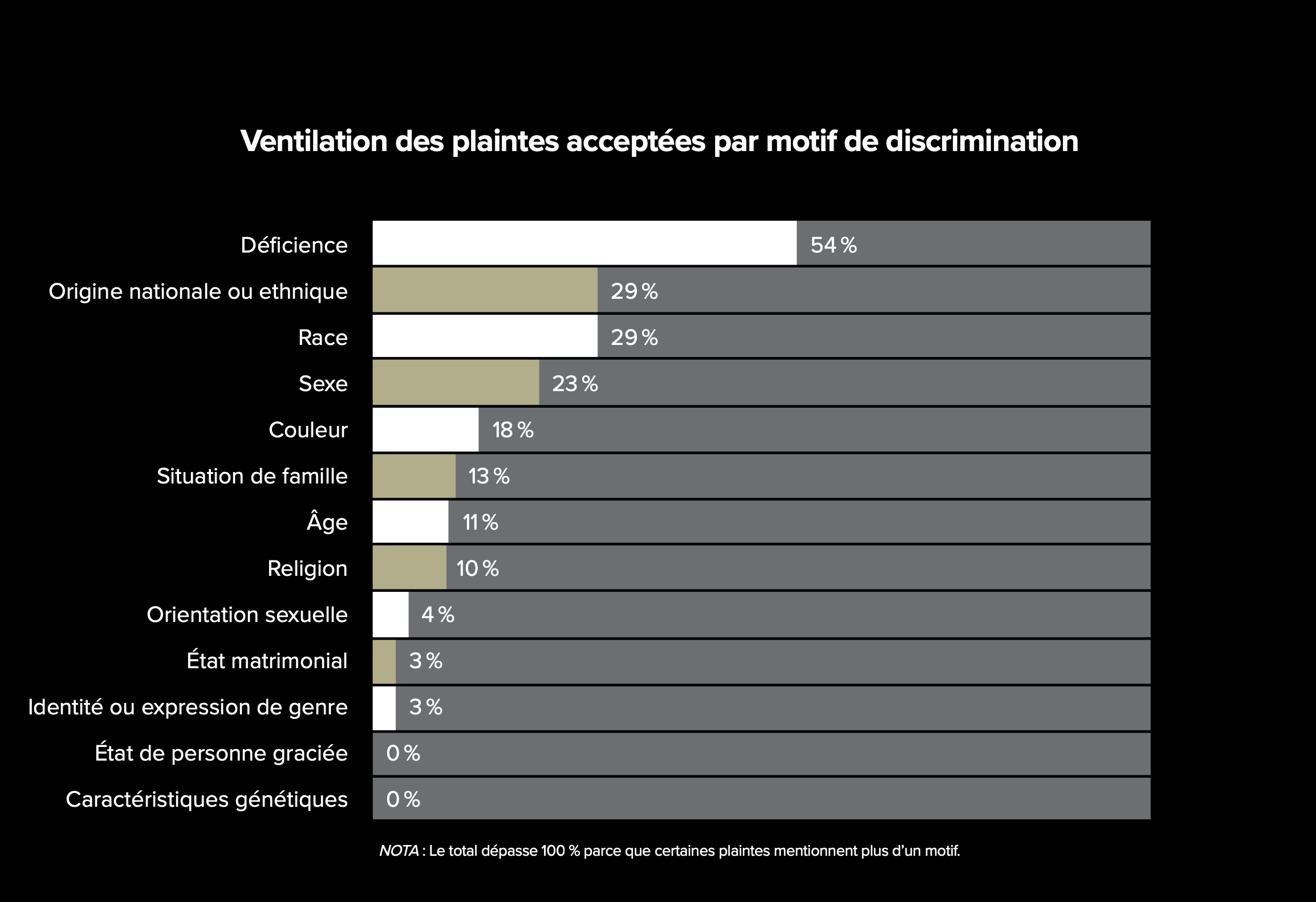 Nota : Le total dépasse 100 % parce que certaines plaintes mentionnent plus d’un motif